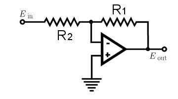 Again, the ratio of R1 to R2 controls the gain. The larger R1, the larger the gain. In this circuit, however, gain is zero when R1=R2. Then the voltage drops are equal, so the output matches the input except for reversed polarity. If R1 is smaller than R2, the gain is negative — the output is reduced compared to the input (it’s rare that a situation calls for this).