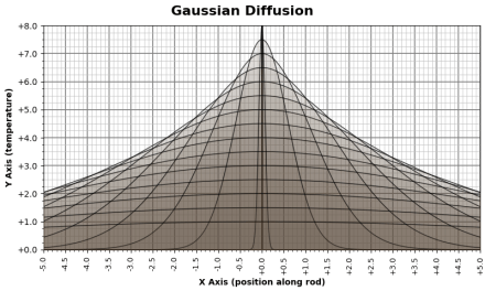 Seen as a temperature function, the height (the y value) represents how hot the rod is at that point (at that x value). Our starting state assumes the heat is concentrated in a small area in the center of the rod. (We assume it was rapidly heated with a blow torch or laser.) In such a case, the heat spreads out (diffuses) over time until the rod reaches equilibrium — the same temperature throughout.