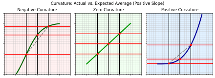 Zero curvature means the slope isn’t changing. Positive curvature means it’s growing more positive; negative means it’s growing less positive (and therefore more negative). Any slope, positive, negative, or flat, can have negative, zero, or positive curvature.