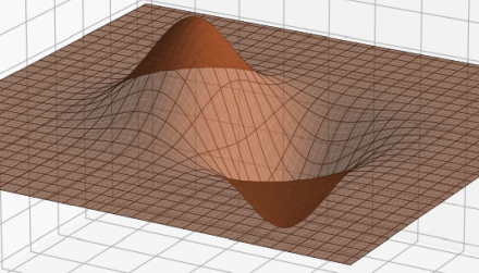 Two points of interest: Firstly, the derivative is zero at x=0 (all along the Y axis). That’s because, if we approach the hill strictly along the Y axis, the steepness in the X direction orthogonal to us. Secondly, the bump and dip taper off in the Y direction.