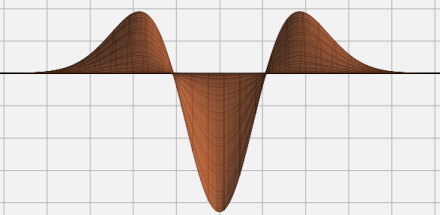 Here’s a graph of the 2D Gaussian second partial derivative over x (now height indicates the curvature of the slope of the Gaussian hill):