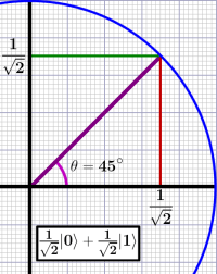 It shows the equal superposition of the |0〉 and |1〉 states with the state vector (purple) at 45° angle between the horizontal and vertical axes (which represent the two states — they are the eigenvectors for those states).