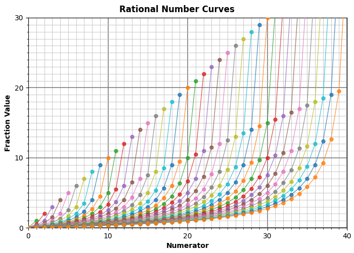 Remember, all chains start at zero (in the lower-left corner). Each chain ends at their sum-1 max value — that top-most angled row of dots. For example, the orange dot at coordinates (20,20), just above the center of the graph, is the end of the #21 chain. That dot is the fraction 20/1, hence the y-value of 20.