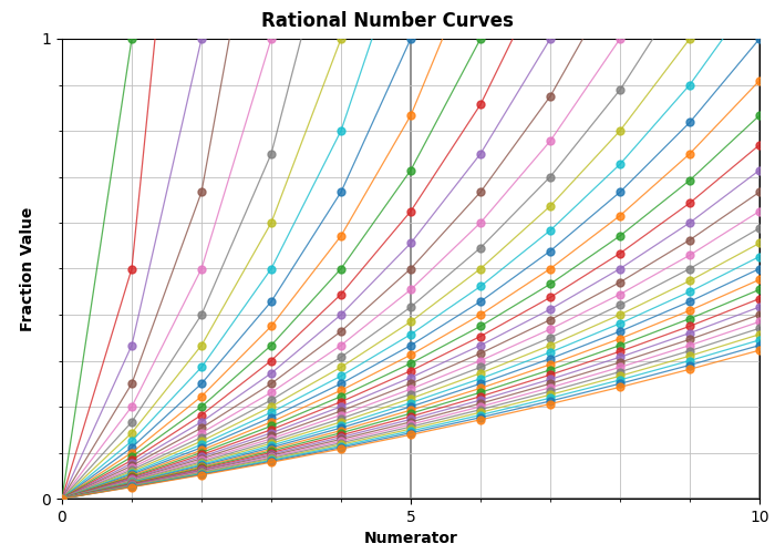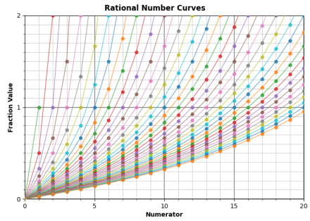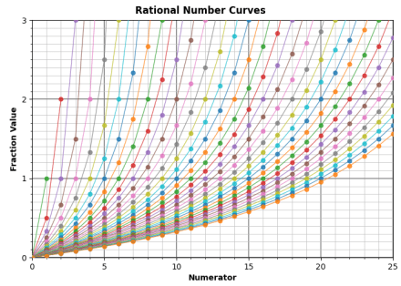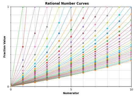 For any given numerator, the fractions become closer and closer together as chains pile on. For instance, the blue dot on the top edge at center, on the vertical x-value line 5, is a fraction from the #10 chain. It has the value 1.0 and the sum 10, so the fraction is 5/5. Going down the vertical line, the values are: