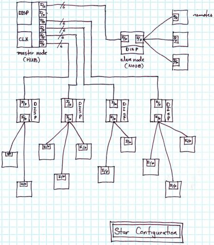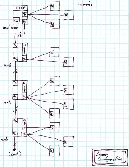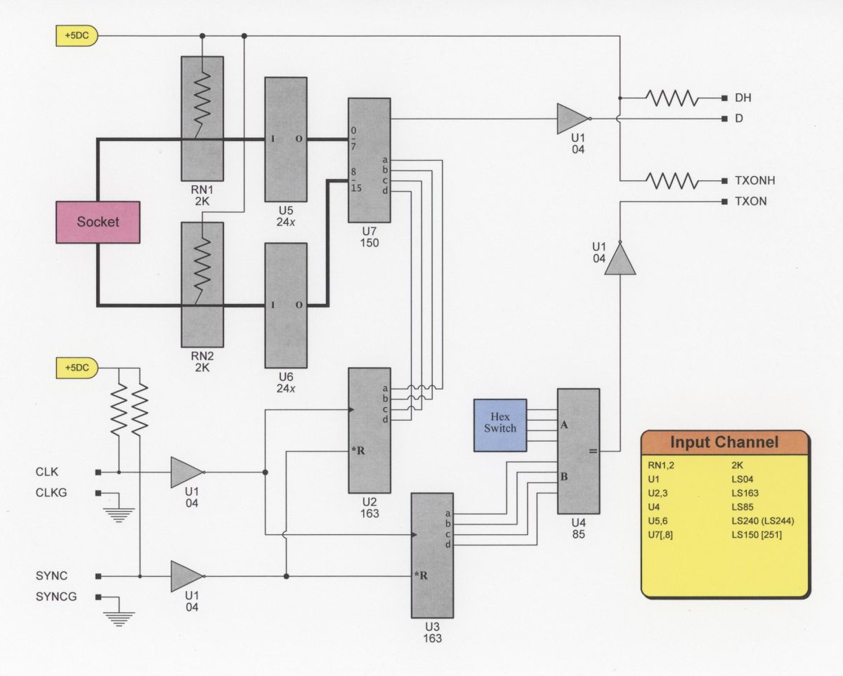 Diagram 2 and Diagram 3 just show the logic circuitry, the TTL part. Both Input and Display modules required network interfaces (NIFs). The Input modules needed to receive the clock and sync signals and transmit their data signals during their group interval. The Display modules needed to receive all three signals.