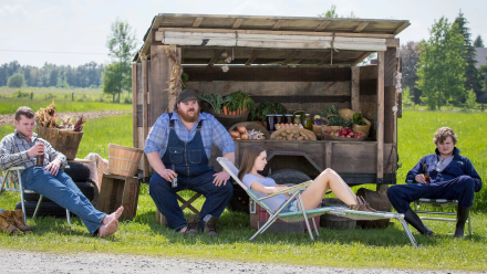 This makes for a large ensemble cast, but things center around a group of four hicks: Wayne (Jared Keeso), his sister Katy (Michelle Mylett), his friend Daryl (Nathan Dales), and his other friend Squirrelly Dan (K. Trevor Wilson). Wayne and Katy own a farm and a small produce stand they run with the help of Daryl and Squirrelly Dan.