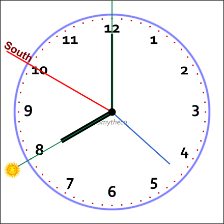 To see how this works, try to imagine it’s 8:00 in the morning, the Sun has recently risen and is somewhere to the east. So, if the hour hand on your watch is pointing east at the Sun, then some angle to the right is south. Specifically, the angle that is halfway between 8:00 and 12:00.