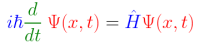 Red: (capital) Greek letter Psi (Ψ), the quantum wavefunction for the system in question. This is one of the key pieces of the equation, and it appears on both sides of the equality. Note that it takes two parameters, x and t. The latter tells us this form of the Schrödinger Equation is time-dependent (time is a parameter). The former is the single dimension of movement. (A version for three-dimensional space requires x, y, and z.)