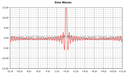 The contributing sine waves are shown in light grey. The red curve — representing the most probable location of the particle — is their sum.