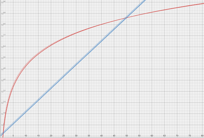 Note both the logarithmic vertical scale and its extreme size (up to 10⁹⁶). In extreme contrast, the horizontal scale is linear and only goes up to 80. (At least it’s more than eleven.)