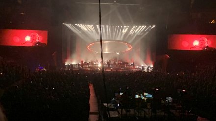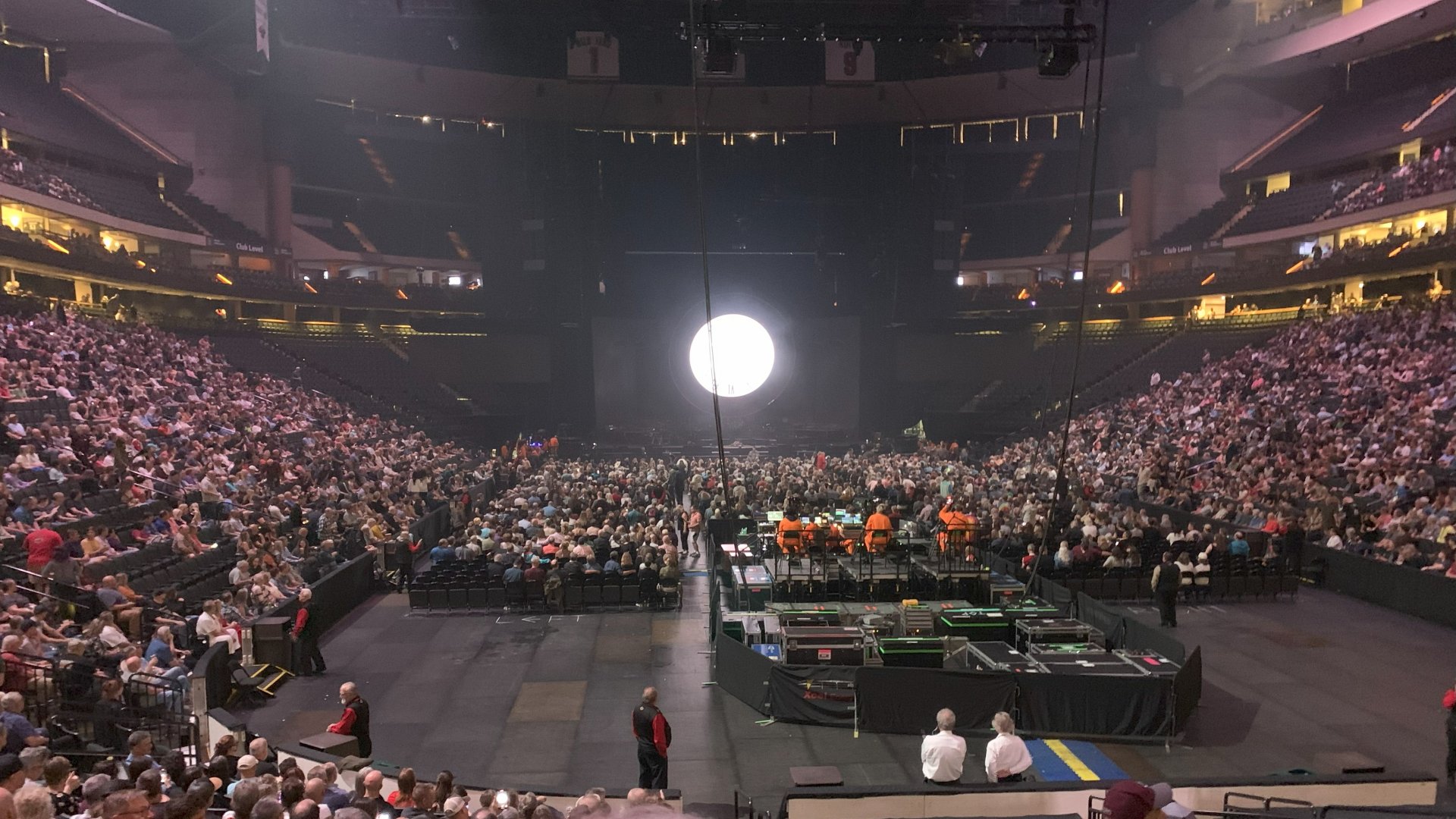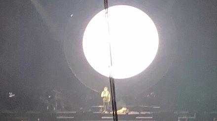 My phone’s camera could barely handle the light blast. The production design used a neat effect I don’t believe I’ve ever seen before. They had large round mirrors they could control up and down and angle them. Those bright disks along the top of the stage are the back mirrors. (There are three side mirrors on either side of the stage, but the photos haven’t shown them off so far.) Strong lights on the floor shine up into the mirror and are reflected wherever desired on the stage or out at the audience as in the photo above.