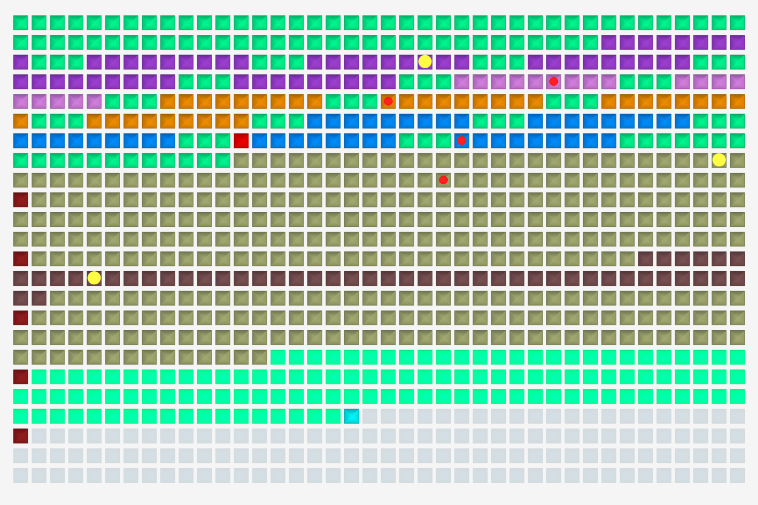 I re-rendered the image to bring it up to date. The bright blue stone at the end of the rows of retirement spring green is where I am now in those 960 months. Colors code various phases of the past. That long tan section is my career at The Company. That dark band in the middle of that is my all-too-brief marriage.