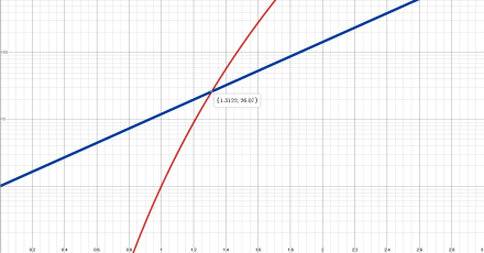 Figure 4a. Curves for xn (red) and nx (blue) with n=12. Note the crossing at x=1.3122 where both curves have the value 26.07.