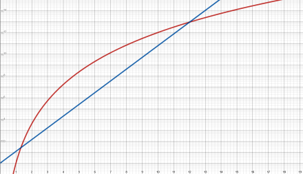 And (almost) nine trillion is certainly less than twenty-two trillion, so the exponential slope is greater than the polynomial slope at the crossing.