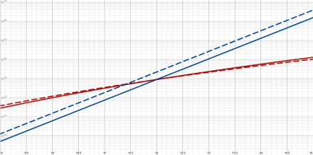 Figure 7. Closeup of the crossing at x=12, y=8,916,100,448,256. The dotted lines are the derivatives, and the blue derivative (exponential) clearly has a higher value than the red one (polynomial) at x=12 (see text for its exact value). Note that the polynomial derivative matches and crosses the polynomial curve at this point. The polynomial, its derivative, and the exponential all have the same value at x=12.