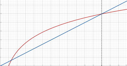 Of course, we’ve seen how the earlier crossing indicated the polynomial curve was steeper, so any conclusions we draw about x=n depend on the curves not crossing again. But n=12 gives us an even-order curve — a flat-bottomed parabola. So, there’s little reason to suspect the curve changes direction.