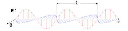 Figure 3. Electromagnetic light wave with wavelength λ and moving in the Z direction. The E axis is the electric field, and the B axis is the magnetic field. For our purposes, we’ll only bother with the E field.