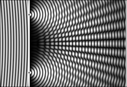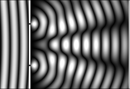 The basic task is to determine the intensity (height) of the wave as it travels along a straight line. In Figure 2, to the left of the mask (white vertical line on the left side), a beam of light is coming from some out-of-sight source far to the left. That beam is mostly blocked by the mask except for two slits that allow the light to pass through.