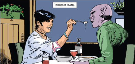 I mention this because the Goliath storyline exists in the comic but in very different — and vastly — better form. Goliath belongs to a different alien species but is also stuck on Earth. But he finds love and success as an artist.