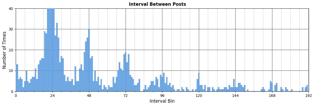 Interesting also that the usual time-between-posts is strongest for just one day with strong, but decreasing, signals for two, three, and four days. There are no big spikes in the data after the eight days represented here.