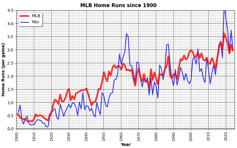 Some folks are concerned about the steadily rising rate of homeruns, but others see it as a draw for the fans. Everyone loves seeing a good homer. Some of the bumps may reflect “live ball” eras while some of the dips may reflect “dead ball” eras or times when a change to the pitcher’s mound altered the dynamic in favor of the pitcher (in response to batters doing too well — the goal is evening the odds).