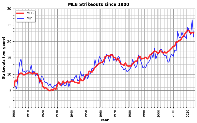 Or at least that’s the claim. Strikeouts have also been on the rise overall, but the bump in the 1960s does seem to match a decline in homeruns that same decade. And note the strikeout bump in the first two decades in comparison to the lowest rate of homeruns in history. They switch in the 1920s as MLB tried to rebalance the odds.