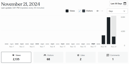 For all the hits, there was zero engagement. No likes, let alone comments, so I had no idea what was going on. Tuesday topped out at 2,483 page views, Wednesday at 7,581 (for a total of 10,064), and Thursday it was around 2,100 before things finally settled down (for a total of over 12,000 views). On the other hand, no real uptick in visitors: 68 on Tuesday, 83 on Wednesday, and 60-some on Thursday.