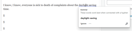 Bite me, Microsoft. There is no hyphen in daylight saving. (Technically, it’s also not “savings” but that ship seems to have sailed.) I’d turn the damn thing off, but most much of the time I appreciate its advice.