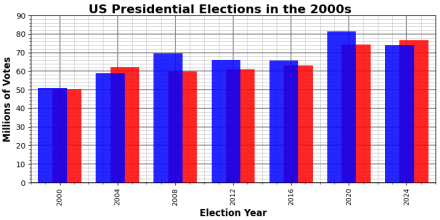 The recent election is a new factor in all this. While I do have concerns about the new administration, I’m far more affected by what the election said about people and their views. In the last post, I presented two graphs of US elections in the 2000s. Late counts have changed the numbers somewhat, so here they are again (with data fresh off the web).