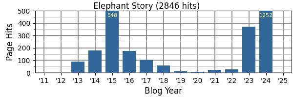 The #3 post, Elephant Story, had what I thought was its day in the Sun back in 2015. But there was a sudden jump in 2023, and in 2024 views are again (literally) off the chart:
