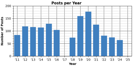 However, this doesn’t account for the 50 posts I published on my Substack blog in 2024, so that last bar is actually much higher. In fact, it turns out total posts in 2024 was 130.