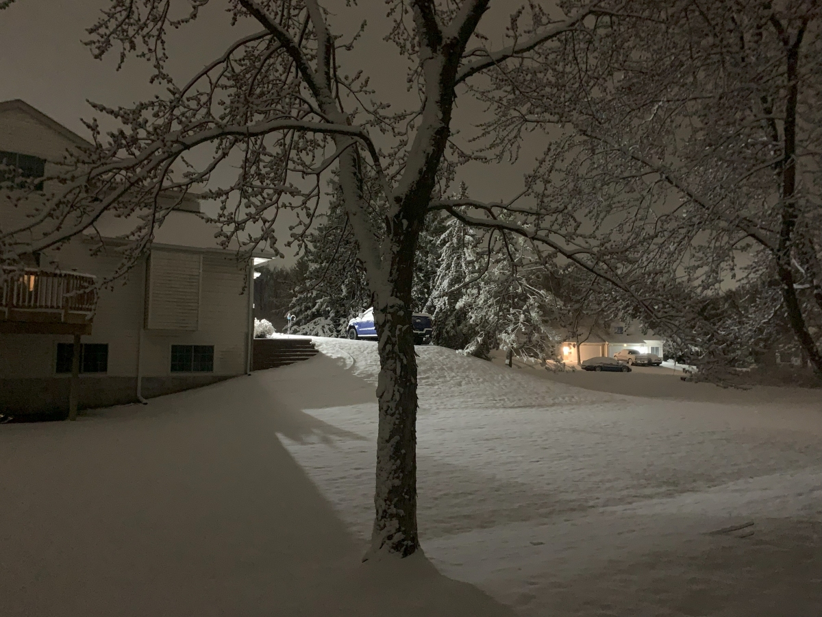 From April 2nd (at 1:08 AM) after a wet snow that stuck to the trees. In part, I wanted to see how my iPhone camera did with a night shot (pretty good).