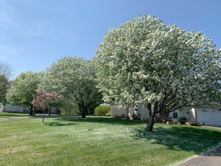 The mock apple trees were in bloom, which I love. They only bloom for about a week and then litter the ground below with pedals (already happening in the picture). Very pretty (and they come in pale red-lavender; you can see a little one on the left).