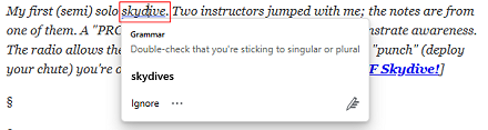 Again, it seems to have trouble with singular versus plural cases. Nothing in the sentence, “My first (semi) solo skydive,” implies any kind of plural. It was the distraction of these increasingly common off-the-wall interruptions that drove me to making screen captures. That’s what seems to have changed. It has become more annoying.