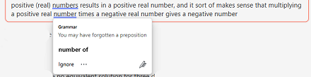 It’s bad enough that terms like “positive numbers” sometimes throws it (referring to just “the reals” usually does, though it seems happy with both in this sentence). Yet in this case it thinks I forgot a preposition. Here again, I would think that “number times a number” was such a common construction that an Ai trained on text would recognize it readily.