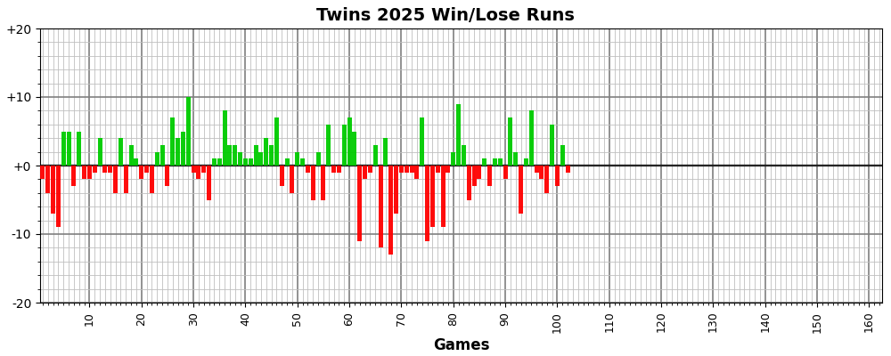 This is number of runs a game was won or lost by. Clearly more red than green. The worst of it is away games, where we’re 21-33 (a pathetic .389). For a while they were acing home games but then lost a few and are down to 28-20 (.583), which is still a winning record, but not as good as it was before June.