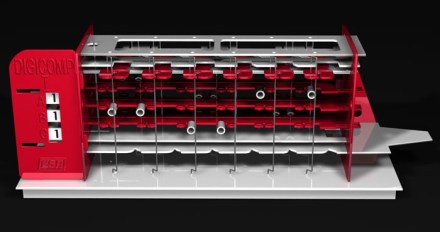 The Digi-Comp I. Made of plastic and some metal wires (metal for strength, not for carrying electrons). The machine had three bits — the readout you see on the left could display either 0 or 1. The metal bits are the vertical wires. These catch on the white cylinders used to “program” the computer. Those are slid onto fingers on the three horizontal red pieces in the middle.