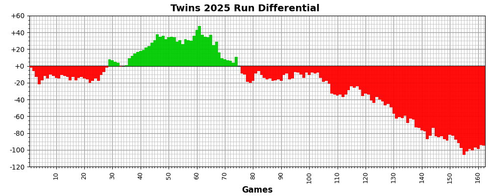 I’ve long been a believer in run differential (between runs scored and runs allowed) as a good indicator of a team. (Obviously, winning games requires scoring more runs.) The chart above shows the same curve as the win percentage chart but signals the problem more intensely (no doubt the green and red help).