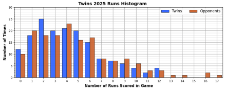 Notice that the Twins never managed to score more than 12 runs in a game.