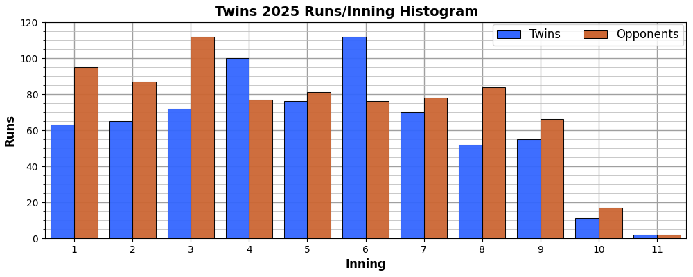 The sixth inning is when a starter is near the end of their stint. Or it’s when the starter has already been taken out and the Twins are facing a new pitcher from the bullpen. I’d guess more for the former, because the last three innings don’t show a lot of runs, which argues against it being the bullpen.