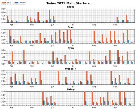 Our key starters, Pablo López, Joe Ryan, Simeon Woods Richardson, Zebby Matthews, and Bailey Ober, had generally decent seasons, especially López, Ryan and Woods Richardson.