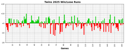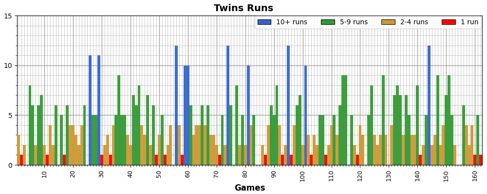 Going back to runs scored, this chart shows how many runs the Twins scored in each game: