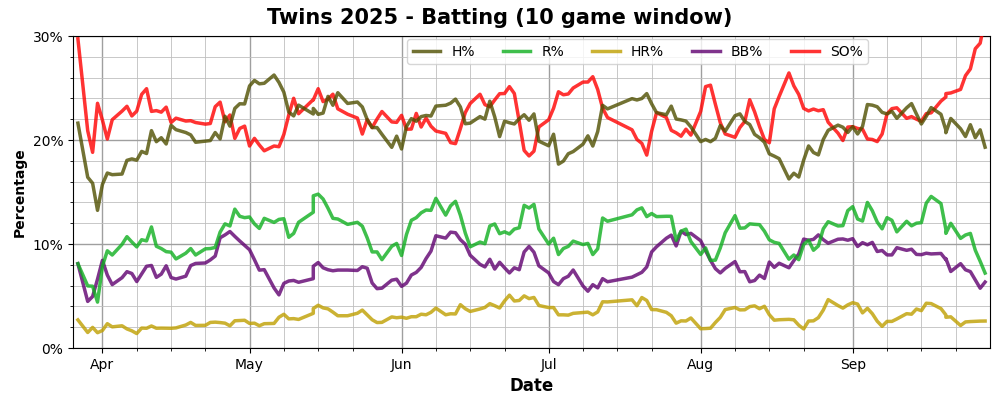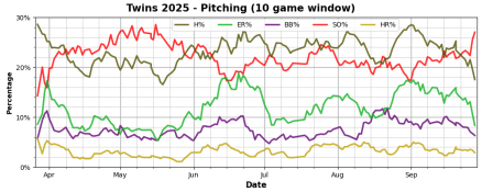 Two last charts. Both feature rolling averages with a ten-game window. Note that good stats on one chart are bad stats on the other. For instance, lots of strikeouts are good for pitchers but bad for batters. Conversely, lots of hits are good for batters but bad for pitchers.