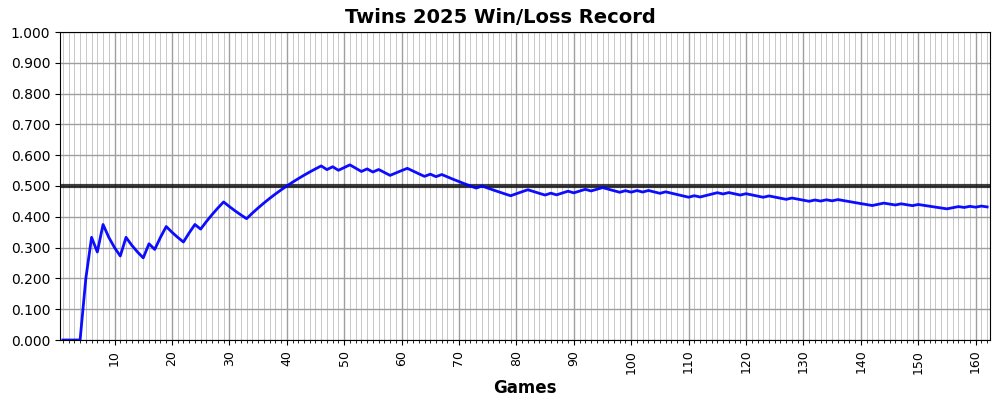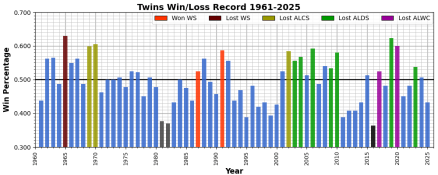 Dismally, over their history as the Twins (they used to be the Senators), they have 5106 wins with 5183 losses, giving them a franchise record of .496 — not a winning team. It’s visible in the chart above. More years fell below .500 than above it. Their worst year, 2016, is in black. Two runners up for worst, 1981 and 1982, are in gray.