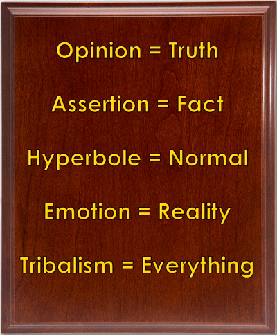 Since the 1970s I’ve perceived a devaluing of intellect and education and an elevation of feelings and opinions. For some years, I’ve had a plaque above my desk that reads: