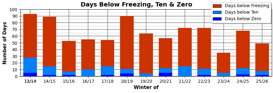 Note to self: change the chart title. I went with “&” rather than “and’, which made the Oxford comma I’m addicted to look odd, so I left it out. I’d prefer it be “Freezing, Ten, and Zero”. I do like the new category. Might be interesting to see “days below +20”.