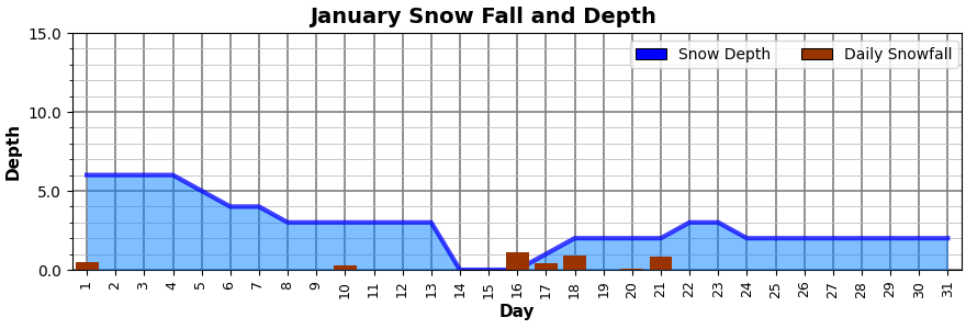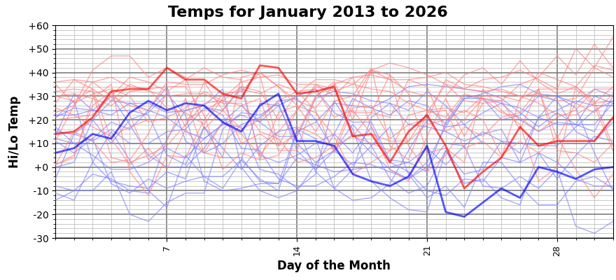 No days anywhere near freezing from the 17th on. That brought the average high down to just over +20 degrees with an average low in the single digits. Quite a few sub-zero lows, too.