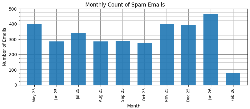 In the last Friday Notes post I wrote about how I was tracking spam emails on my oldest email account (created in the 1990s, so it ended up on a lot of lists). I said January was shaping up to be a bumper crop.
