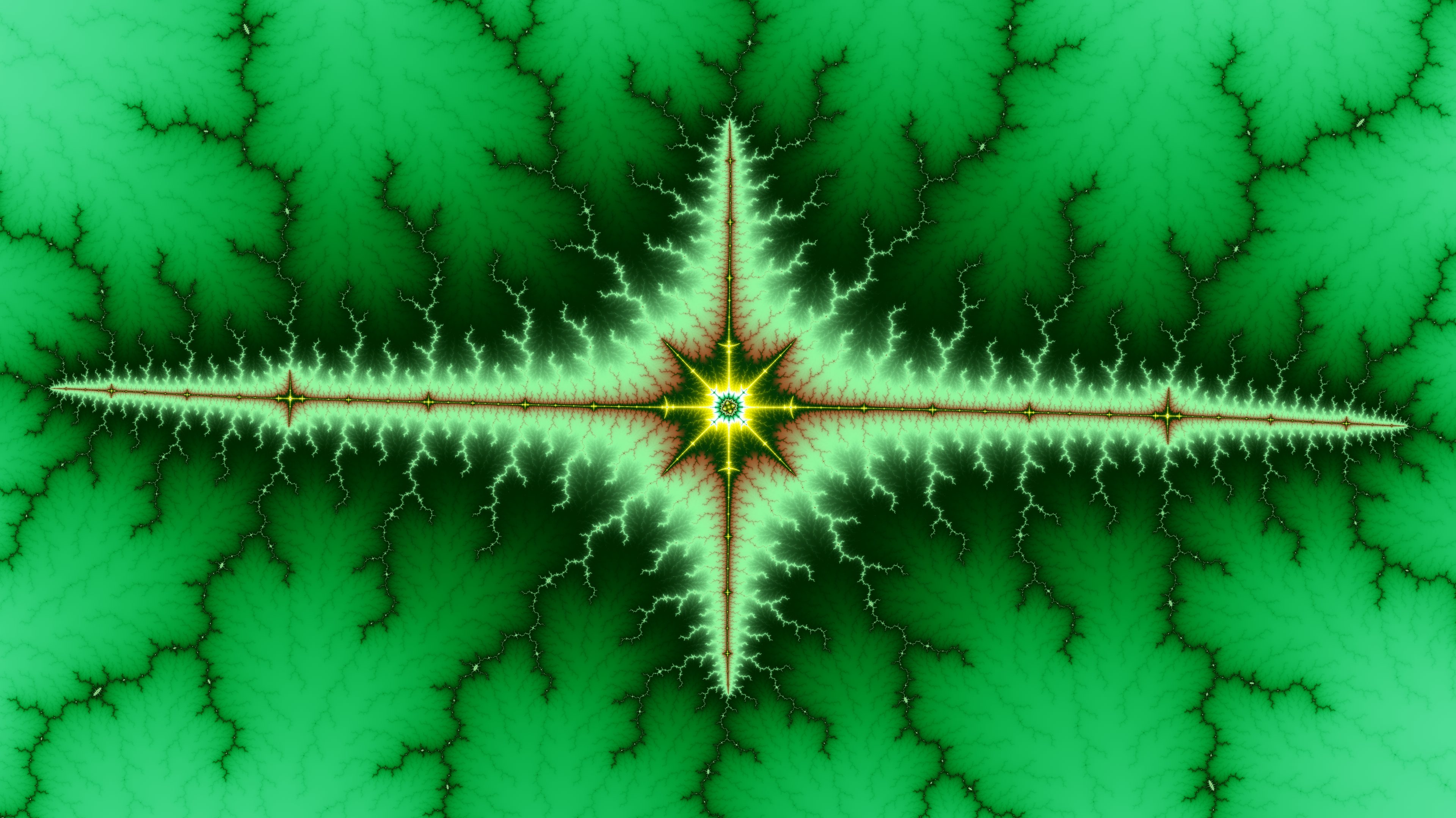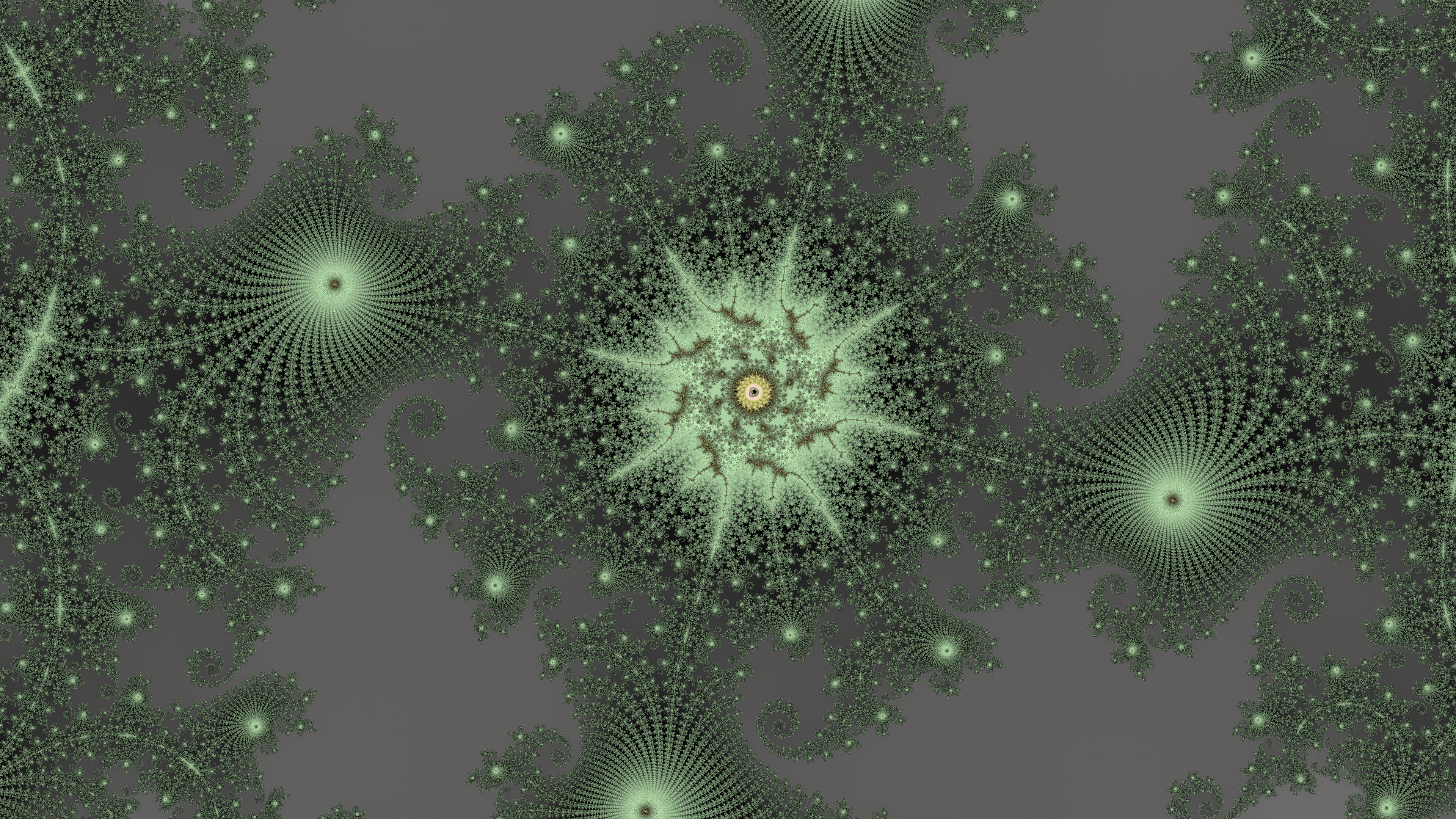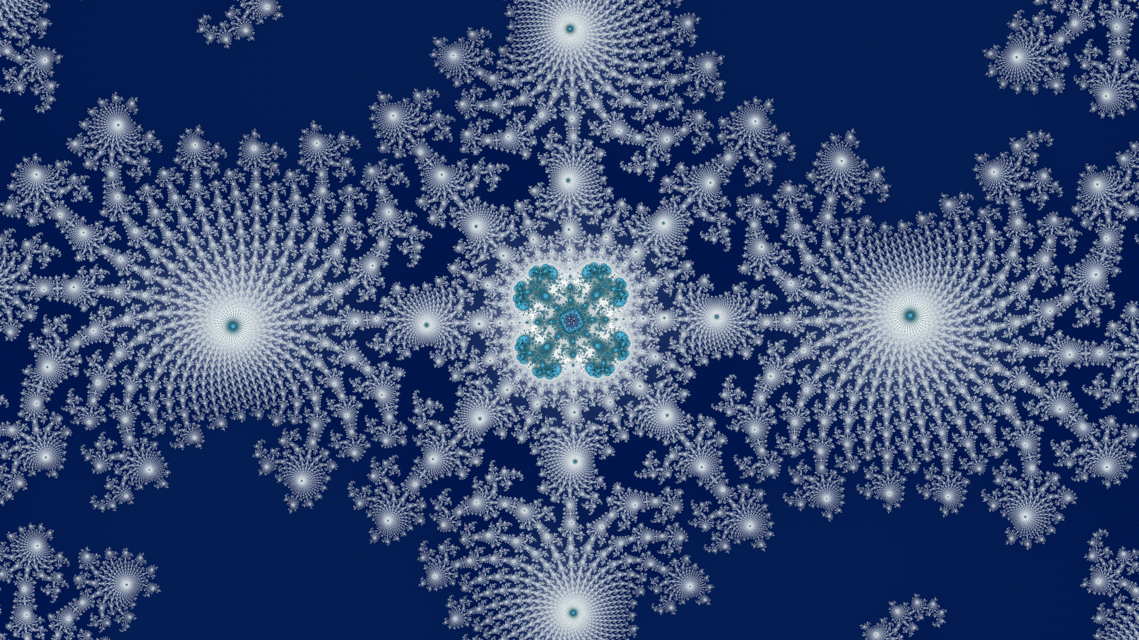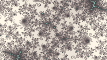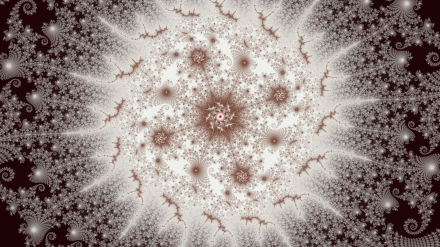 This, and the bronze/gold one above, illustrate something we see a lot while zooming down towards a mini-brot. There is a “radial frequency” — the number of branches coming from a central point. In the image above, 16 branches extending from the large cyan circle, but the circle itself is made from a much larger number of branches coming from the 16 “nodes” inside the circle.