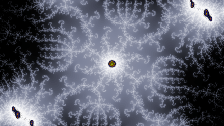 Each circular bay has a “stalk” extending away from the Mandelbrot, and images like the above are zooms of parts of the stalk. These have interesting nodes with high radial frequencies — lots of branches extending from the nodes.